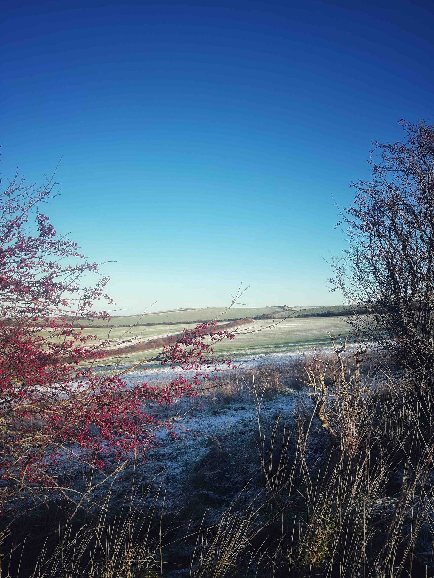 This has been a week of hugging the fire and dreaming of spring and summer. The sparkling blue skies of last week were replaced by low, grey skies and endless rain. The dogs get me outside, always a good thing. I walk along the Ridgeway, the least muddy of my regular routes, and despite the clouds, my mood lifts. Tangles of rose hips, hawthorn and old man’s beard arch over the path, and dozens of tiny field fares bounce from thicket to thicket in front of me. The route back takes me along the edge of an uncultivated field, the seed heads of wild carrot, sorrel and cow parsley swaying in infinite shades of brown. The biggest treat, almost missed, comes when I look back over my shoulder right at the end of the walk and see a pair of hares sitting on their haunches watching me from the field. I stand stock still, but the dogs come back to see what I’m looking at, and the hares flee. Hares and owls. I love all wildlife but I feel a special connection with hares and owls and I’m not sure why.